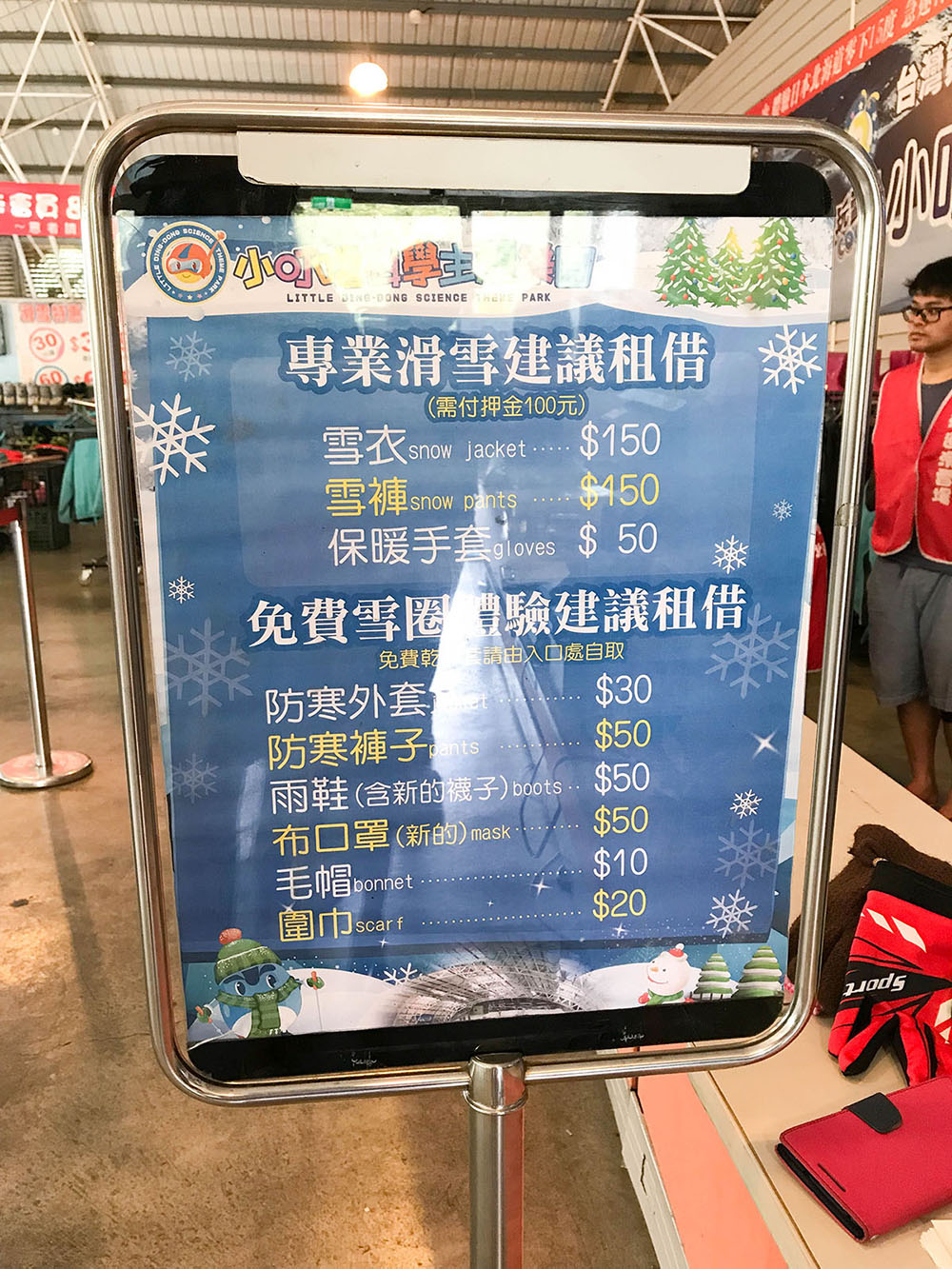 租借免費雪圈體驗的衣物收費非常便宜,外套NT$30 (約HK$8)、褲子NT$50 (約HK$14)、雨鞋含新襪子NT$50 (約HK$14)。