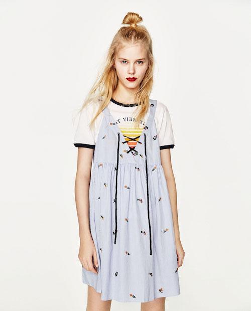 4. 刺繡款在近年都很流行,直紋淡藍色系的連身裙上刺上可愛的黃色紅色小花圖案,穿起來特別的年輕。按此查看