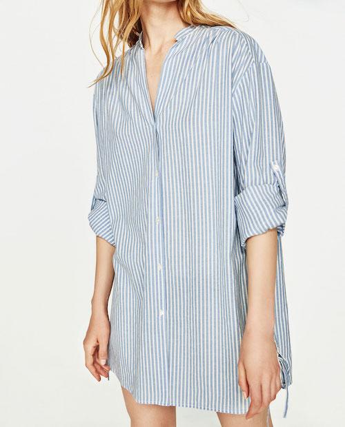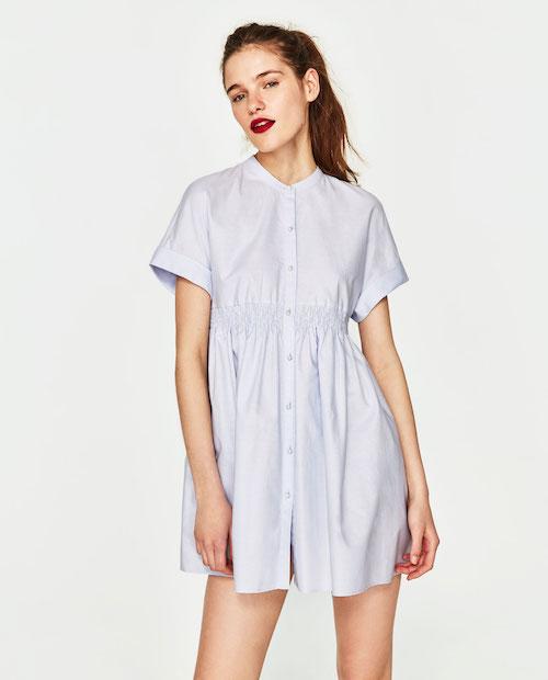 2. 讓雙腿在視覺上長一點,再長一點⋯⋯那就要靠高腰來營造效果啦!短短的襯衫連衣裙再配搭高腰的束口設計,年輕之外更添點性感的魅力。跟模特兒一樣綁起頭髮,都變得俐落。按此查看
