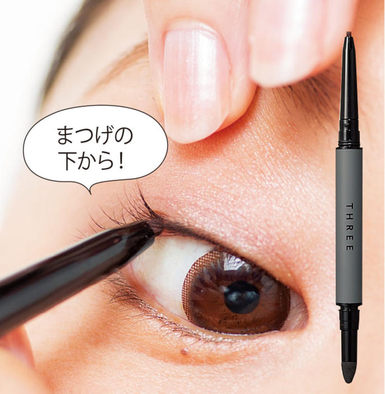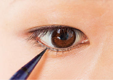 要強調內側眼線的存在,用鉛筆型的眼線來畫,從眼睛的內角睫毛的下側開始跟著眼睛的形狀畫。記得要用防水型的黑色眼線筆哦!