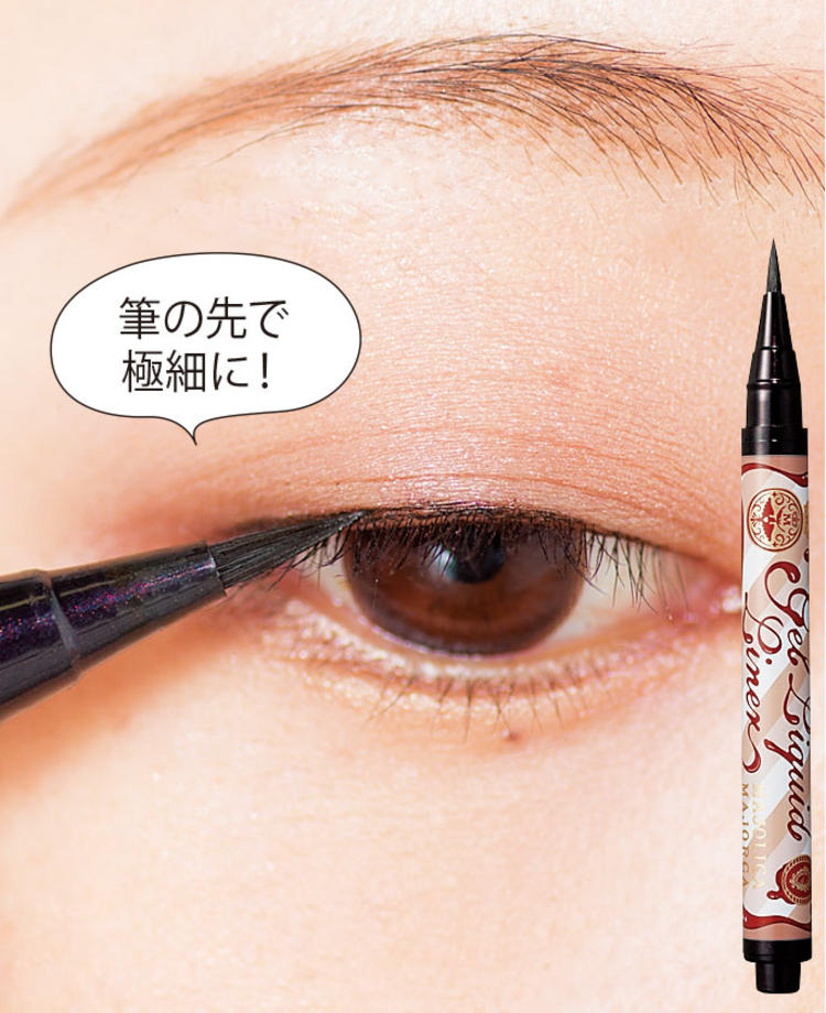 用極細的眼線液畫上外眼線,關鍵是用超細與超尖的眼線液來畫哦~從內眼角畫到外眼角。MAJOLICA MAJORCA的眼線真的是超好用!