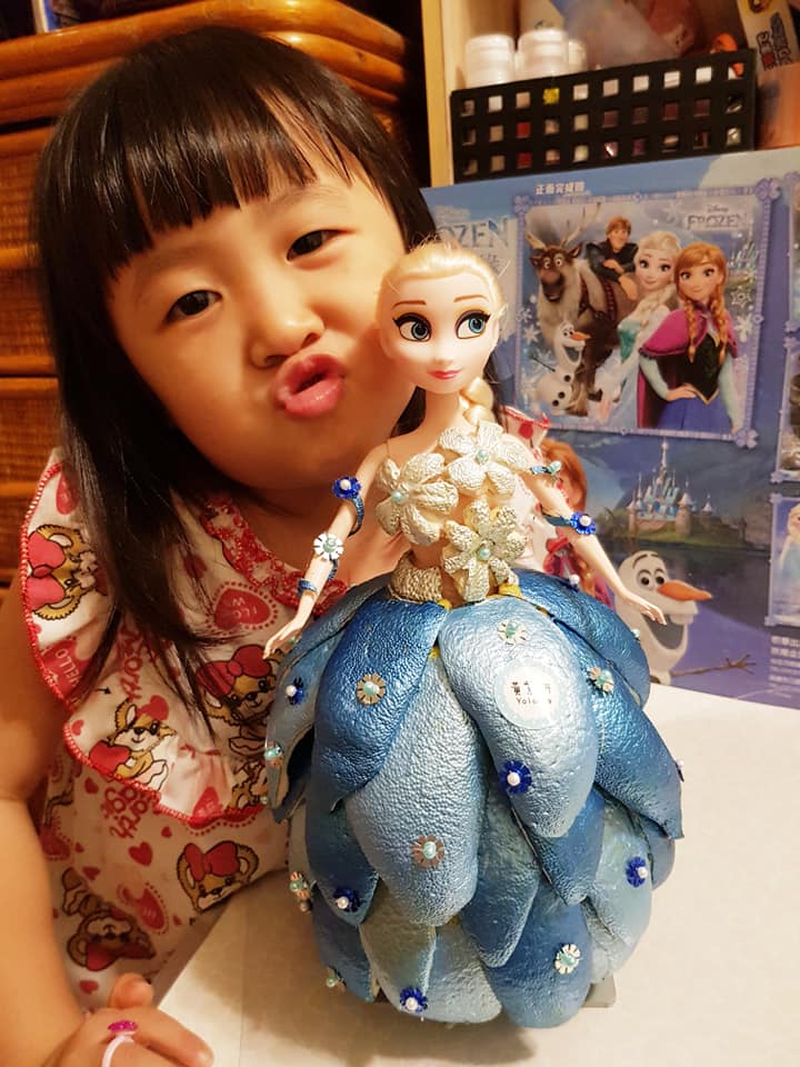 用柚子皮裁成一片片的裙擺,用壓克力顏料塗上顏色,再一層一層的黏上,就完成艾莎的裙擺啦!