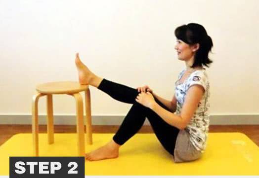 2. 抬起一條腿放在椅上,盡量伸直膝蓋,保持這樣的姿勢30秒,挺直腰背,同時拉伸小腿肚的肌肉,兩腿交替。
