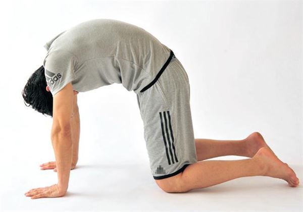 3. 四肢著地,邊吸氣邊把背部反折成弓狀,接著邊吐氣邊縮肚子,盡可能把背部拱起。