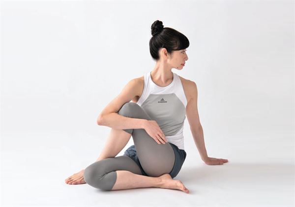 2. 盤腿坐,一隻腳跨過另一隻腳,放在膝蓋外側,挺直背脊,邊吐氣,邊把上半身往跨腳的那側扭轉