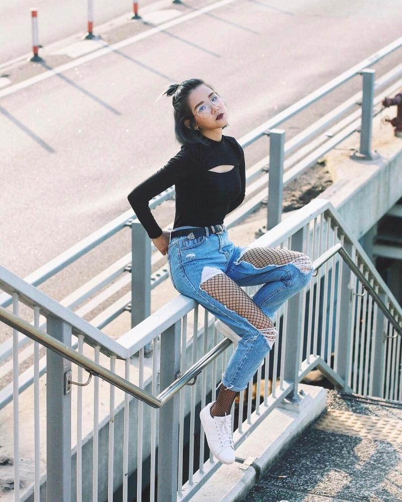 像是下圖中都穿上了歐美流行的魚網絲襪內搭牛仔褲,開口上衣,深紅色的咀唇!如果不能接受大尺度的女生可能就不適合了~