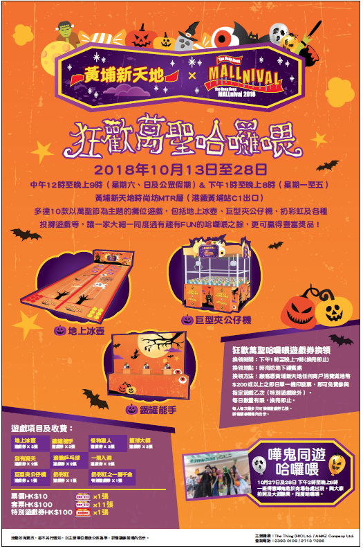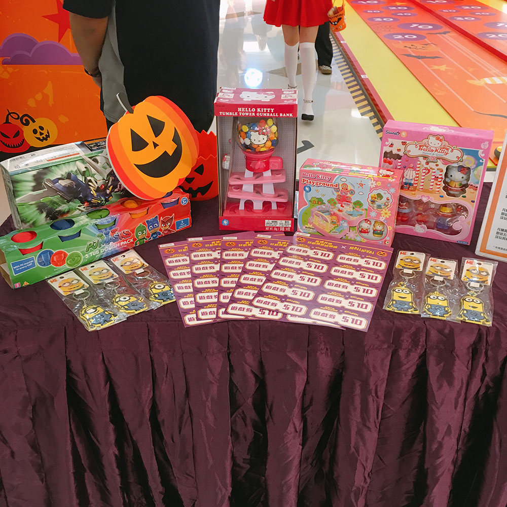 為什麼一開始會說萬聖節不一定要被嚇?因為萬聖節都可以歡樂的玩,愉快的贏取豐富的獎品回家喔~黃埔天地特別於10月13日至28日期間 (共16天),為大家準備了「狂歡萬聖哈囉喂」,有不少的經典的攤位遊戲,包括「扔彩虹之一擲千金」、「巨型夾公仔機」、「鐵罐能手」、「趣怪冰壺」等等。