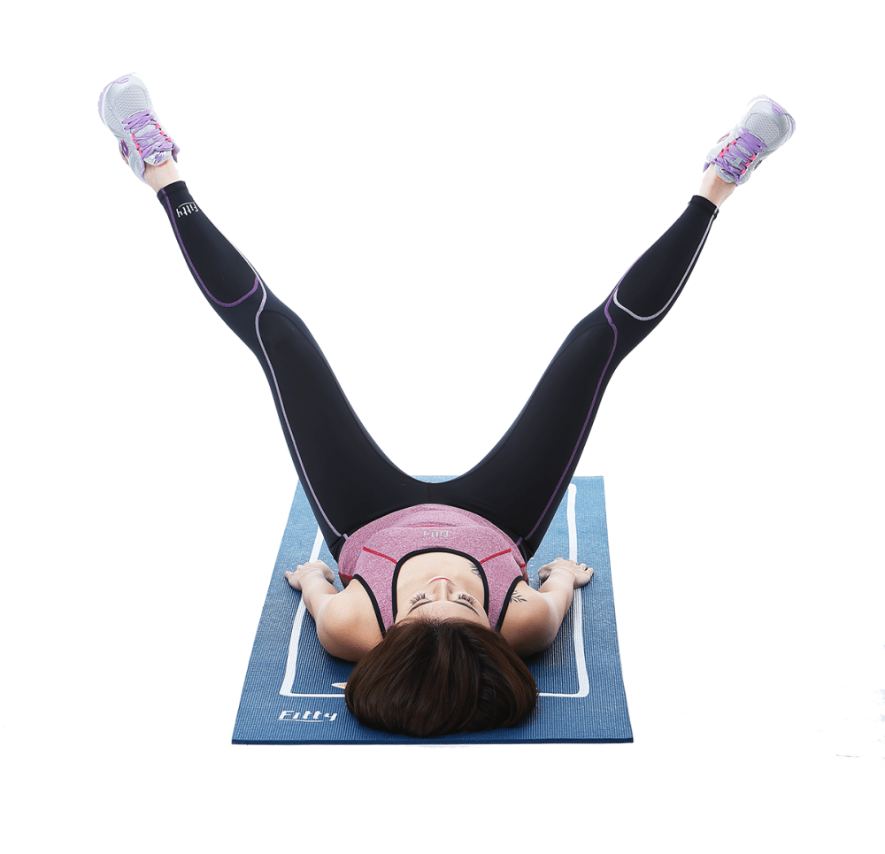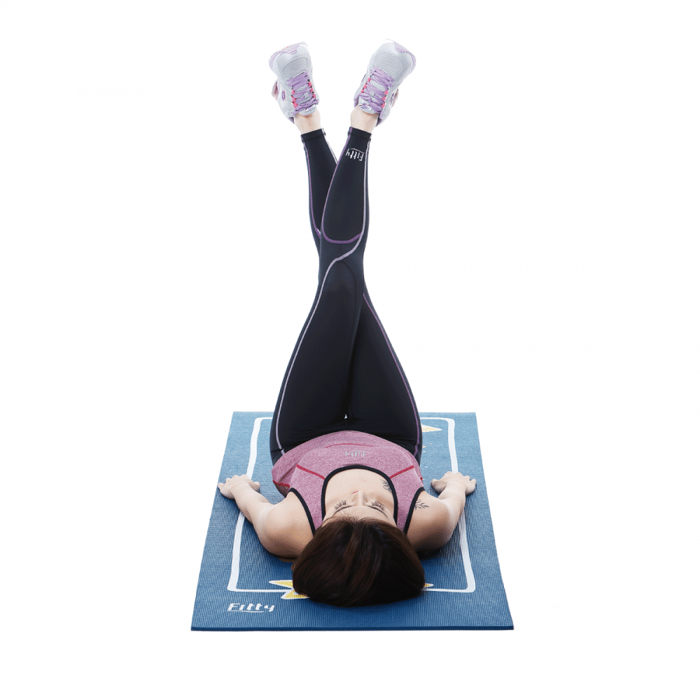 1. 躺在床上/瑜伽墊上,雙手平放、手心向下,然後抬起雙腳。初初可以先雙腳靠牆進行,之後可以再騰空做。