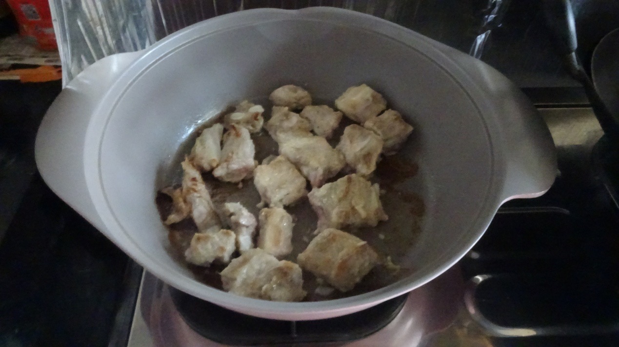 6. 鍋落少少油燒熱,下排骨細火煎香兩邊,再下洋蔥翻炒,