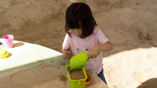▲沙坑已經是現在公園中的必備設施之一了!沙子的微粗的觸感可以提供小孩觸覺上的刺激喔!