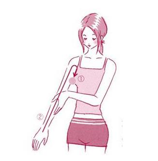1.  在手臂內側的淋巴進行按摩,在腋下的部位用四指輕輕按壓5下,接著將手臂向上舉起,用四指輕輕按壓,接著將手臂舉至頭上,寬度與腰同寬,從手腕部分順流往腰部推引。輕壓5次、推引5次。