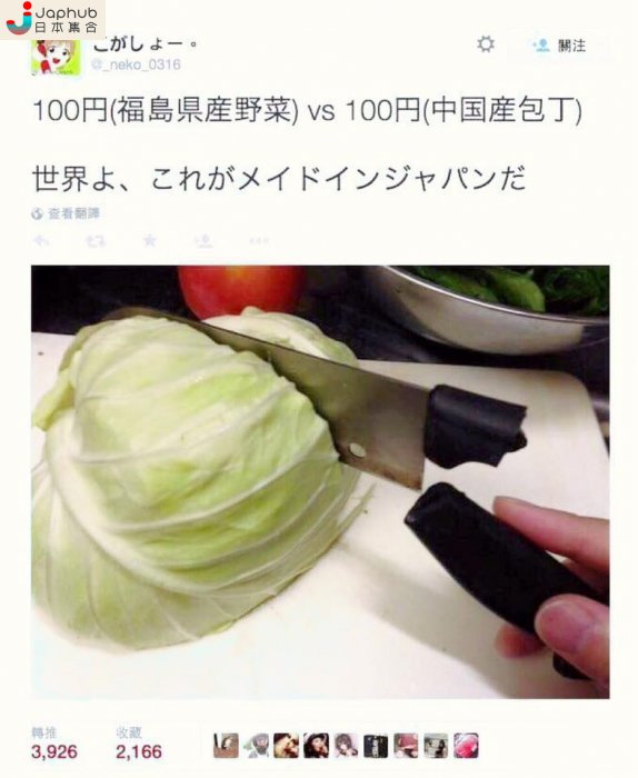 一名搞鬼的日本網民完成了別具一格的實驗,他以100日元購買由福島出產的椰菜,再以同樣的價錢購入由中國製造的菜刀,希望比較它們的「威力」。怎料,這場比賽只是短短數秒,已經高下立見;當日本網民一刀切下去時,刀柄便立即斷成兩截。