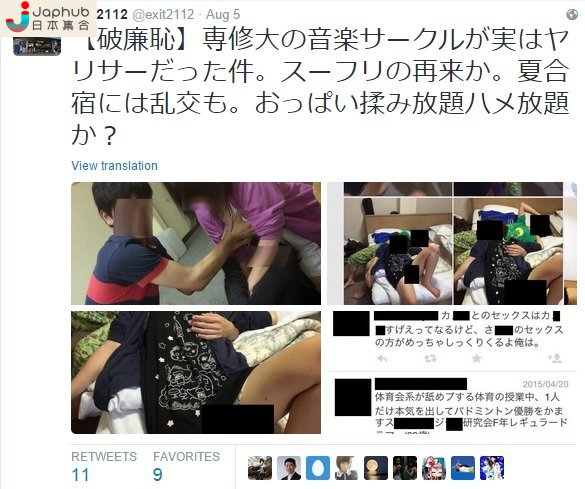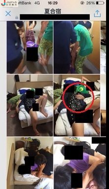 日本有大學生參加夏令營所拍的淫猥照曝光!網民把照片上載到社交網Twitter,日本傳媒隨即轉發,轟動全日本。從照片所示,有女同學讓男同學任摸奶,又有女同學張開兩腿讓人拍照等,非常淫猥。