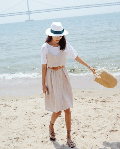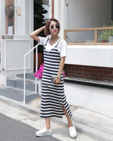 韓妞現在的穿洋裝都很流行細肩帶單品外穿,然後在內裡穿上一件T恤或是襯衫,可以選擇碎花、條紋、格紋或素色等較清爽活潑的花色,秋天則是可以搭配針織、絨布或深色系的款式~如果不想走可愛風的女生可以選擇裙長一點的,而且要留意的是內裡的T恤是白色的會比較好,避免視覺太過雜亂!