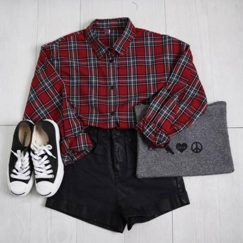 紅色小企領上衣,襯搭格子短裙,再背上棕色的包包;有點復古的英倫風~