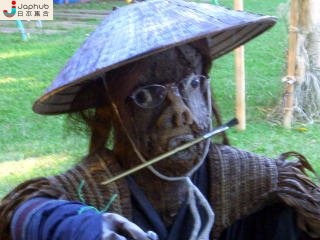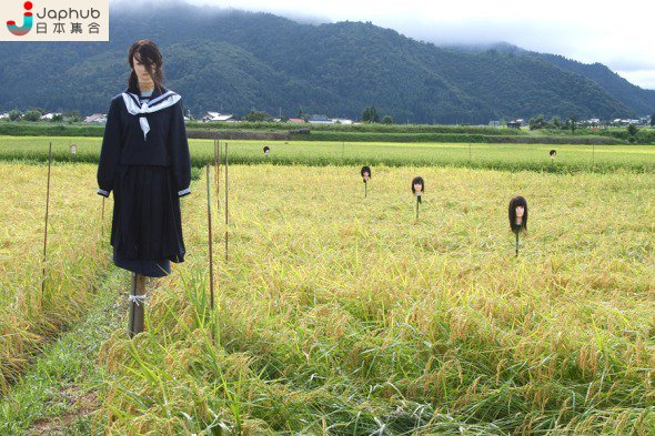▼ 從網友jump_up_ 所上載的照片可以看到,驅趕雀鳥的竟然並不是香港的hea爆CD碟,而是真真正正,看上去超似活人的人性公仔。而更恐怖的是除了等身大的女學生稻草人外,農夫竟然直接將娃娃的頭顱插於田上!