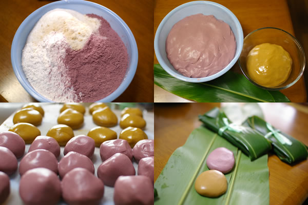 用月桃的葉,裹著白餅、黒糖餅、紅芋餅等年糕,放到鍋裡蒸。