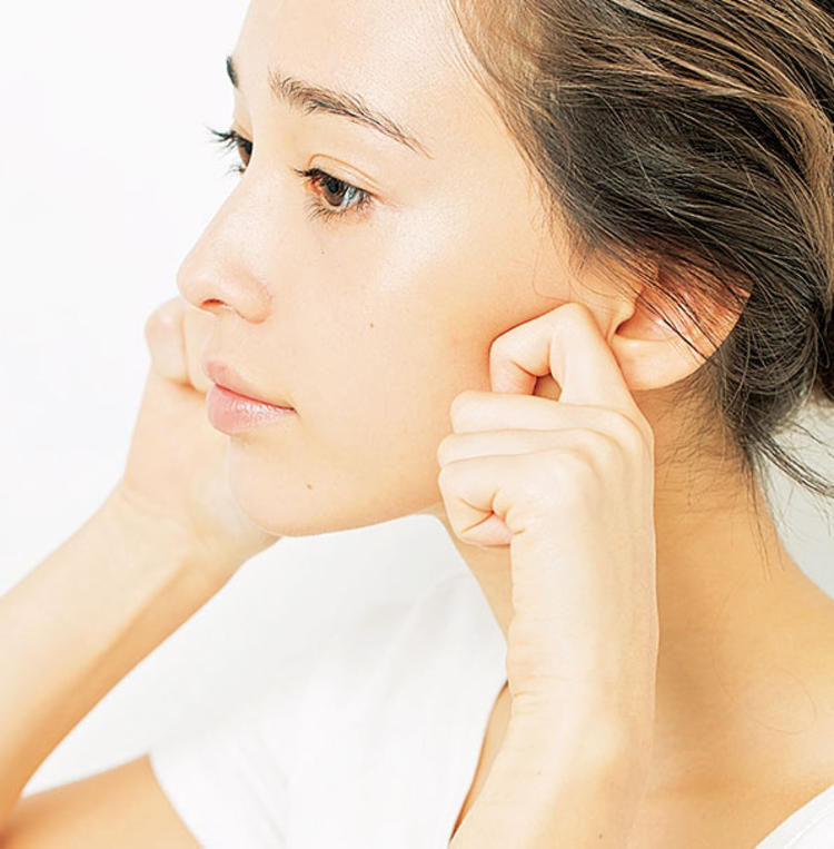 3. 放鬆臉部線條的肌肉,把手作「C」字再從下巴到耳下不斷輕接,把臉部廢物帶出身體。