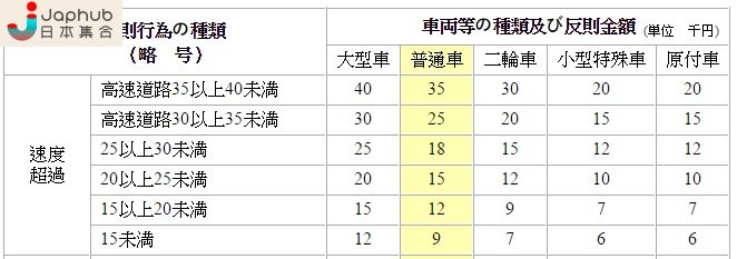 而超速駕駛亦因應不同超速速度而罰款,以超速20km為例,已經需要支付15000円。