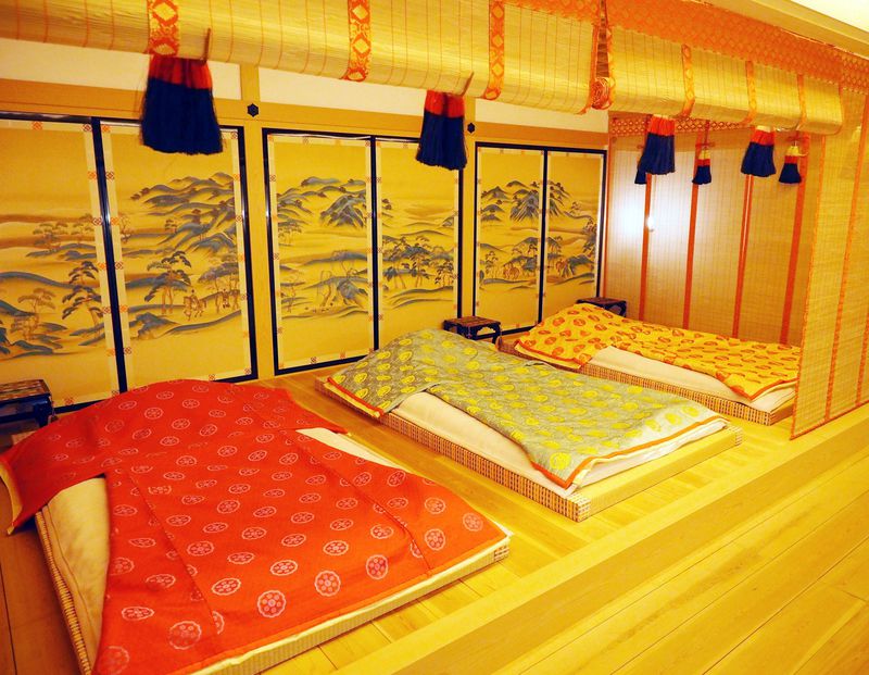 客房金碧輝煌,布團是色彩繽紗的羽織,背後的屏風也很有氣派。旅館規定13歲以上的客人才能入住,而每個房間最多能住3人。