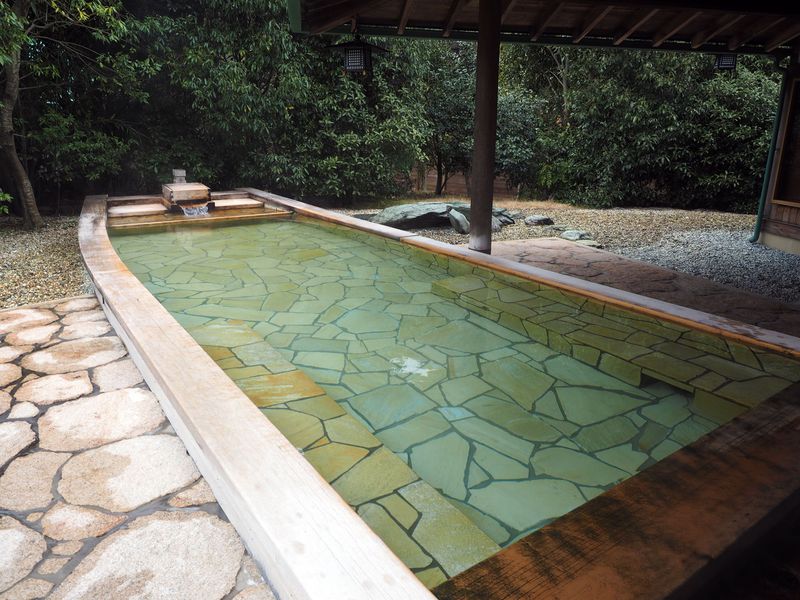 旅館的露天溫泉,泉水有美肌的效果。浴池的外形像一隻船,這是為了重現平安時代貴族坐船觀賞歌舞的氣氛。