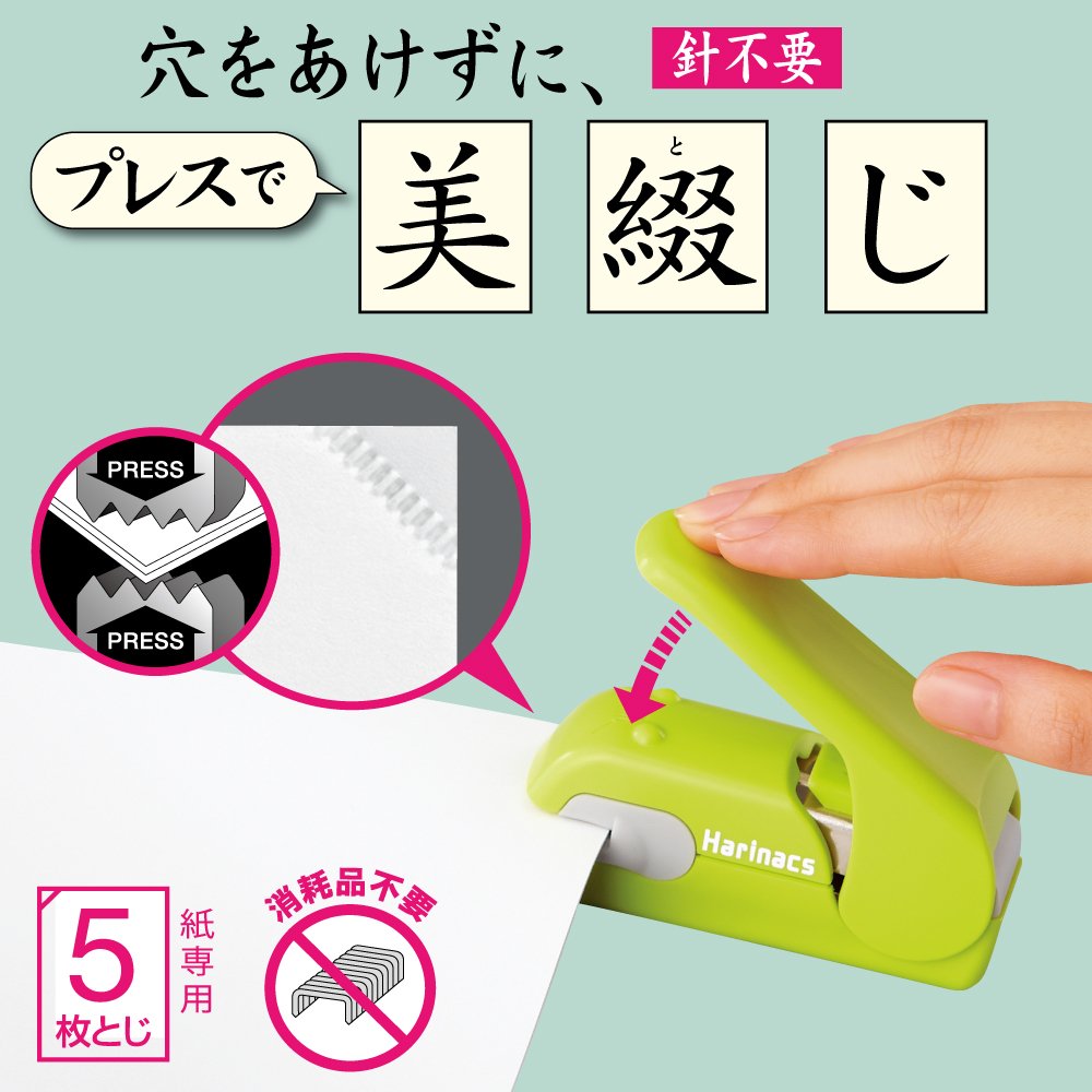 這個釘書機最大的特點就是不需要用釘書針。這個文具將紙張按成凹凸,穩固的互相扣著。