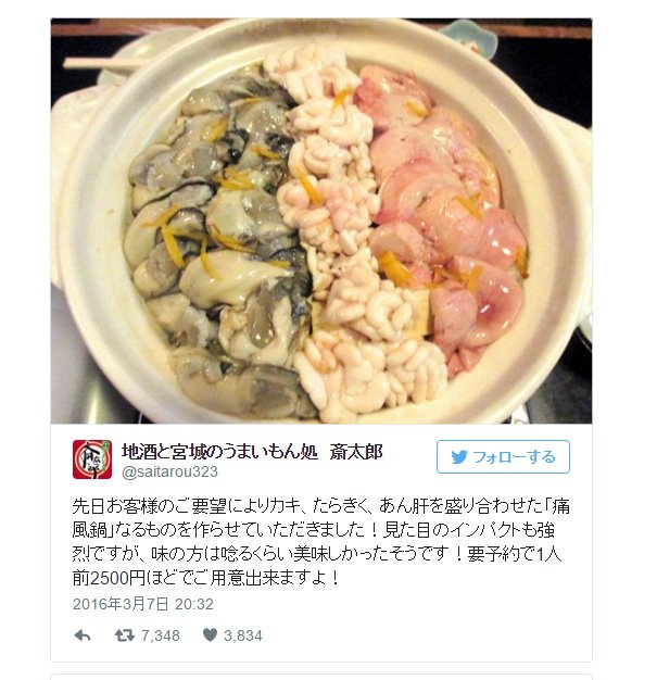雖然火鍋的季節快結束,但前天在仙台的飲食店「地酒と宮城のうまいもん処 斎太郎」,在Twitter公佈將會推出「痛風鍋」。