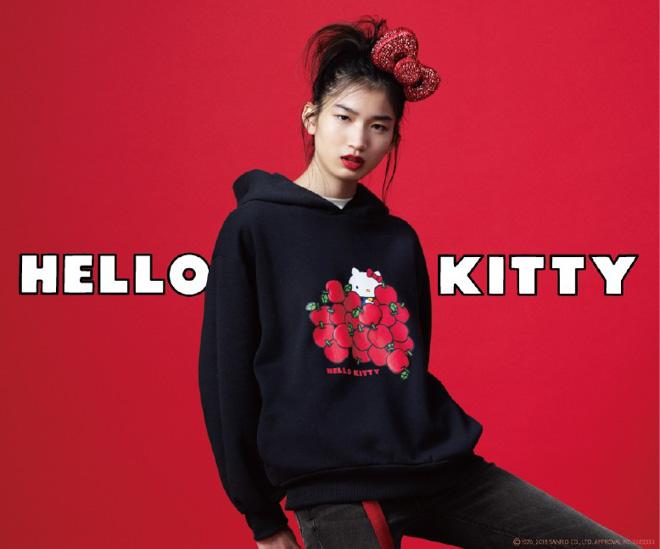 GU與Sanrio人氣卡通Hello Kitty首次推出了聯乘系列,整系列採用了帶有70年代的復古設計,由衛衣到針織外套都加入了手握紅蘋果的經典Hello Kitty圖案。而這次系列著重推出幾款不同圖案的睡衣,分別有淺藍色絨面睡衣、淡粉紅色絨面睡衣、淡粉紅睡衣和白色Hello Kitty圖案睡衣,而全系列單品價格會定在 ¥1490日元〜 ¥2490日元〜