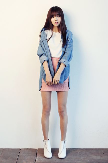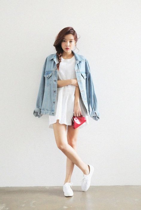 淺色的牛仔外套搭配清純的白色上衣,露出美腿帶點帥氣~