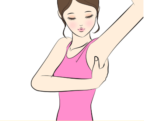 1.大拇指靠在肩膀與腋下的連結處,剩下的四指伸進腋下慢慢地加重力道,確認自己的耐痛等級~到有一點點痛的時候,就可以放鬆!