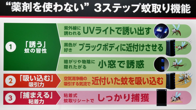 這部空氣清新機名為「蚊取空清」,Sharp強調它不用使用藥劑,就可以達到除蚊效果。而它的原理,其實也挺「土法」的︰將空氣清新機設計成能吸引蚊接近的外型,然後利用空氣清新機的吸力,把蚊子吸進機器裡面的「捕蚊紙」。