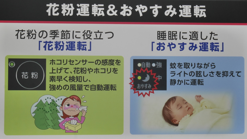 除了「吸蚊」這個獨特功能外,這部空氣清新機也有照顧到花粉季節,備有「花粉運轉」模式來隔除花粉和塵埃。
