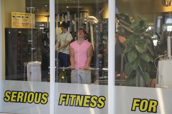 他完成第一場拍攝後,就到了健身室運動。