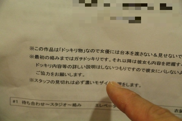 這一場,他要拍攝的,是稱為「ドッキリ」的一種作品,「ドッキリ」是惡作劇的意思,也就是對女優做出意料之外的事情...(有興趣的讀者請自己找片段去看)。觀眾可能會以為這種作品都只是演出,但しみけん說也有些作品是來真的,像這個劇本上就有註明不要讓女優看到劇本,而且不能向她說明拍攝內容。