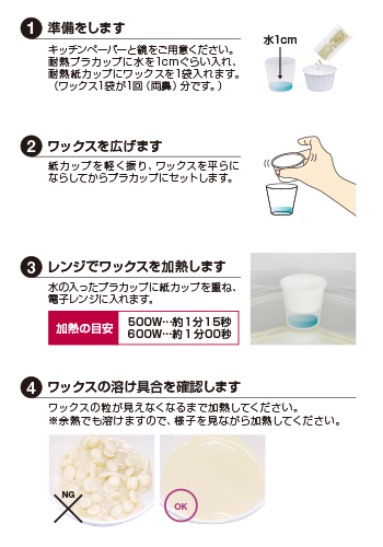 使用方法很簡單,就是用熱水坐熱蜜蠟,並放到微波爐使其融化。