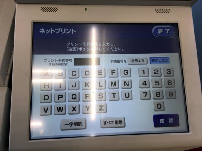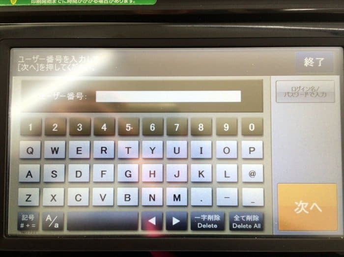 到達便利店後,在打印機表面的小屏幕繼續餘下的步驟。選擇「プリントサービス」「ネットワークプリント」,然後輸入使用者號碼。