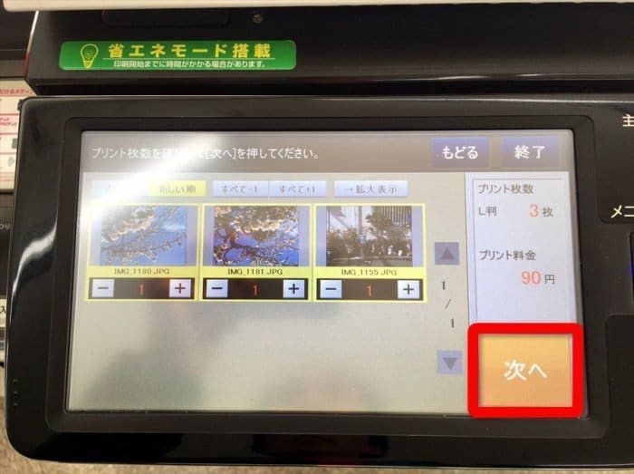 選擇要列印的照片及數量後,按「次へ」。在這裡,也可以選擇為照片加上日期。投入足夠的金額後,按「プリント開始」。