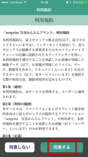 打開應用程式後,先按「写真のプリント予約へ進む」,在顯示使用條件的一頁按「同意する」。