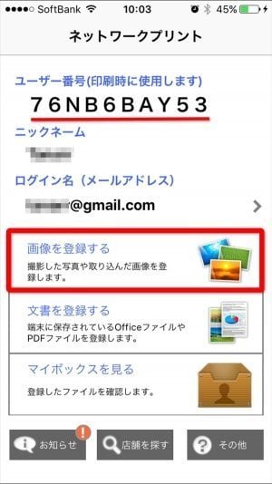 輸入會員名字、密碼後,按「次へ」,完成登錄。回到應用程式,選擇「ログイン」登入,會看到一個「使用者號碼」,在列印照片的時候會用到。