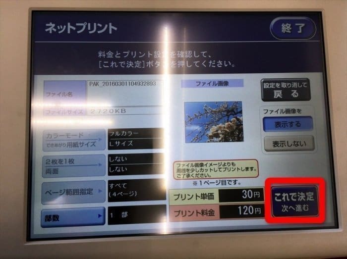 選擇「プリント」「ネットプリント」,再輸入預約編號。如有設定列印密碼,也需要輸入。然後確認列印的數量和價錢,再按「これで決定 次へ進む」,並投入所需的金額,再按下「プリントスタート」。