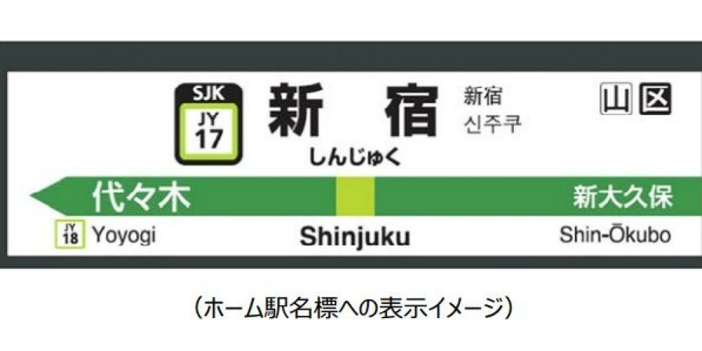 此外,旁邊亦會有附有小長方格,上至下標明站名簡稱、路線及站編號。「SJK」代表「Shinjuku 新宿」;「JY」代表JR的「Yamanote 山手線」,而17就是該站之編號,綠色剛是山手線的顏色。