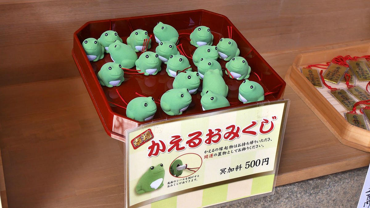在本堂旁邊,當然是求籤和買御守的地方。而這一頭「青蛙神籤」,求完籤還可以當成小擺設。