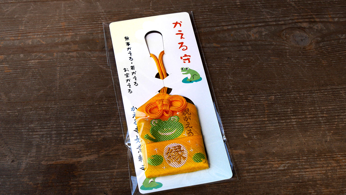 日文裡的「青蛙」跟「回來」寫法是一樣的,這個御守就是要讓你的青春和運氣都「回來」。在它表面寫的是「親がえる」,大家先記著這一點。