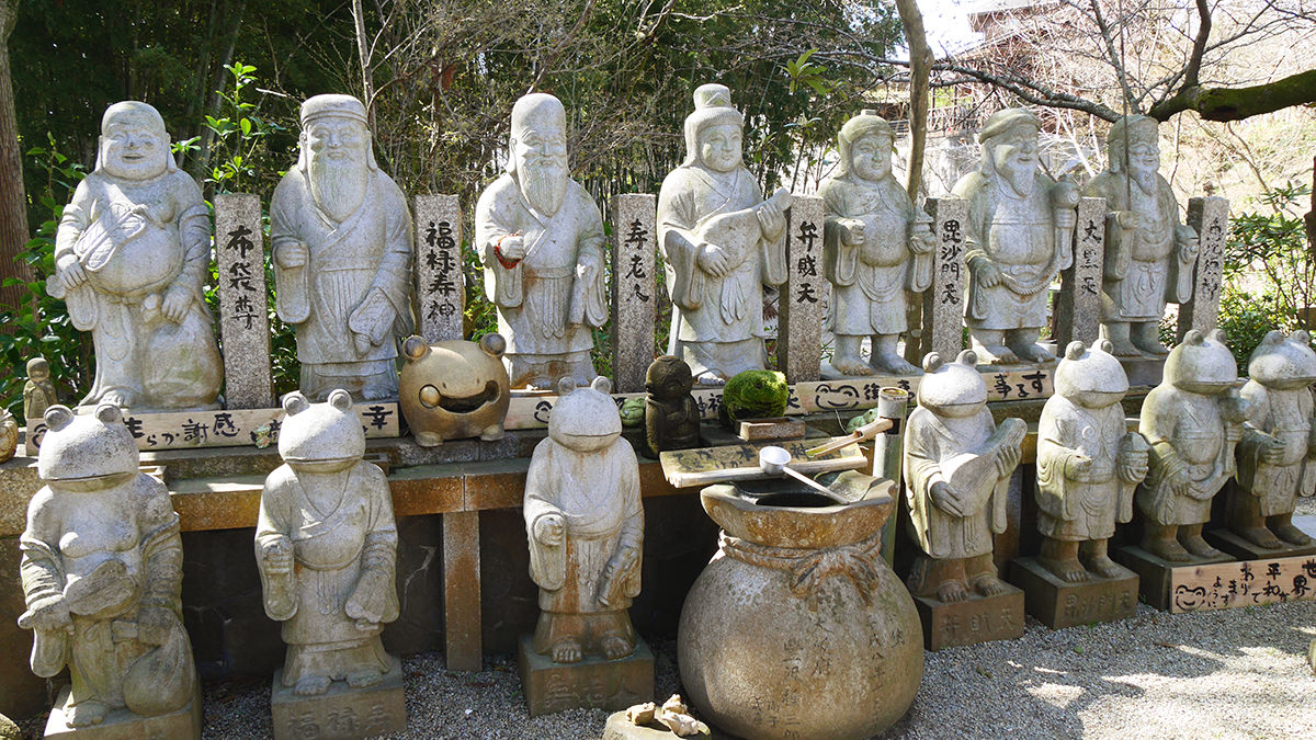 除了平日常見的七福神外,還有「七福蛙」在迎接來客(應該可以肯定牠們跟某國的奧運會無關)。