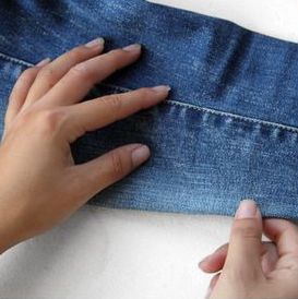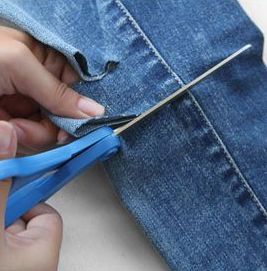 3:先用筆在褲作上記號,這樣就不怕剪錯位置啦。然後,用剪刀在想剪的位置剪下去。注意不要剪太多,不然牛仔洞就會太大了!