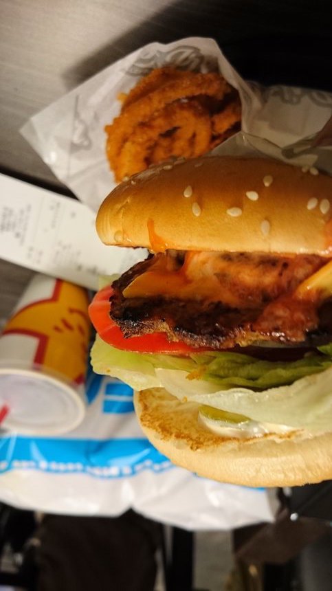 小編叫了個SUPER STAR WITH CHEESE漢堡包,也就是餐牌左上角最搶眼的那個包,外加一份洋蔥圈和中汽水組合,盛惠1280円。由於熟食是即叫即製,所以店員會給顧客一個號碼牌,做好後由店員親自送上。