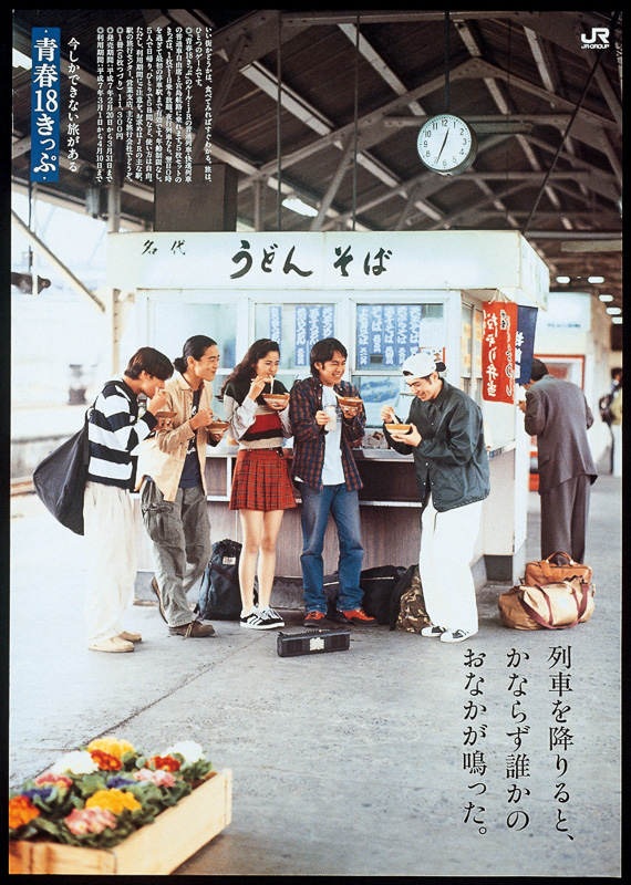 展出的宣傳海報有25年的份量,而其中有一些,已經成為了經典。例如上圖的予讚線下灘站,自從這一張「從月台望出去就是海」的海報推出後,令它一躍而成為全國有名的車站。連續3年的寒假海報,都是在這個車站取景。有的海報,則是宣揚鐵道之旅的樂趣,例如下圖是攝於米原站的立食鳥冬/蕎麥麵,海報上的標語是「一下列車,總會有人的肚子在響」,一群年輕人一起去旅行的快樂,實在令人回味。