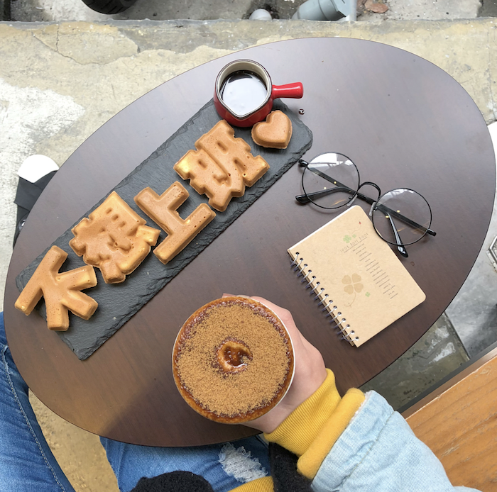 在「不想上班只好喝拿鐵」咖啡店SIS可以品嘗香濃的咖啡外,還可以吃到「不想上班」、「錢不夠用」等有趣字眼的鬆餅〜