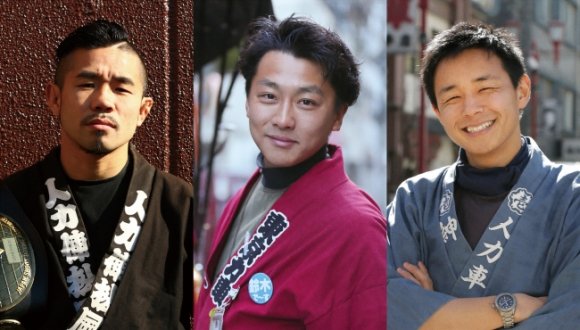 ▼ 而由於要成為俥夫就必須要有強健的體魄,因此不少的俥夫除了拉車之外,平常更是職業運動員。例如在下面這三位型男裡面,最左邊穿黑衣的坂本優起就是一位武道家,以及曾經奪得日本超中量級拳擊冠軍的選手。