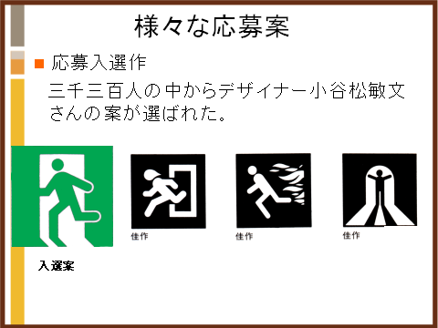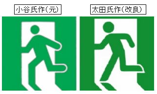 1972年,日本政府進行「緊急逃生出口」標誌設計比賽,最後由小谷松敏文勝出,其作品被太田幸夫改良後,在全日本的公共埸所統一使用,隨後更被推廣至全世界,被各國相繼採用,1987年更被國際規格ISO採納作為緊急出口標示。